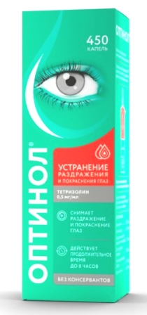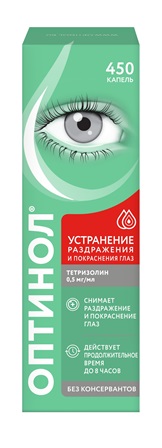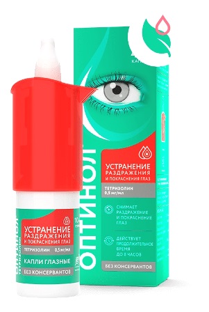 Капли Оптинол Тетризолин – помогают устранить покраснение, раздражение и отек глаз, вызванные неинфекционными факторами (дым, пыль, аллергия и т.д.)